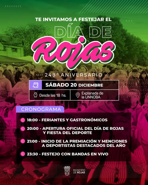 De esta forma, la municipalidad de Rojas convoca a cada uno de los que componen la región a participar de la ceremonia en donde no solo se celebrará un nuevo aniversario de la localidad que fue fundada el 20 de diciembre de 1777, sino también a ser parte de la llamada Fiesta del Deporte a partir de las 18 horas.
